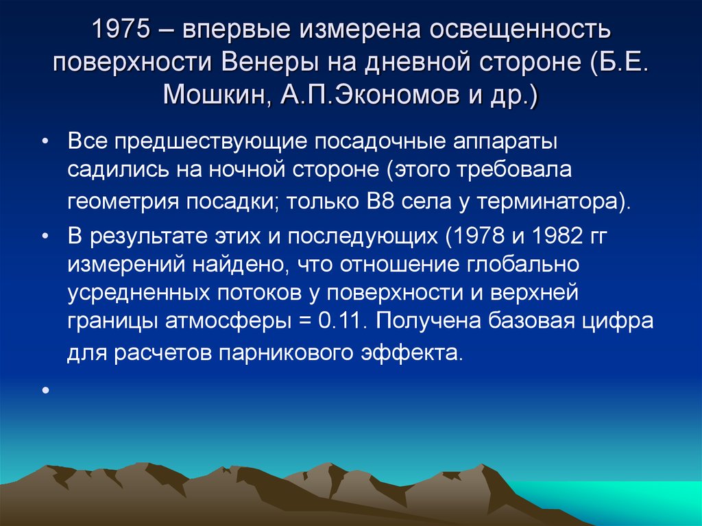 7. 1975 – впервые измерена освещенность поверхности Венеры на дневной стороне (Б.Е. Мошкин, А.П.Экономов и др.)