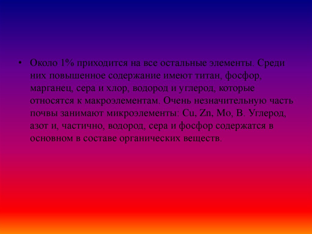 • Около 1% приходится на все остальные элементы. Срединих повышенное содержание имеют титан, фосфор,