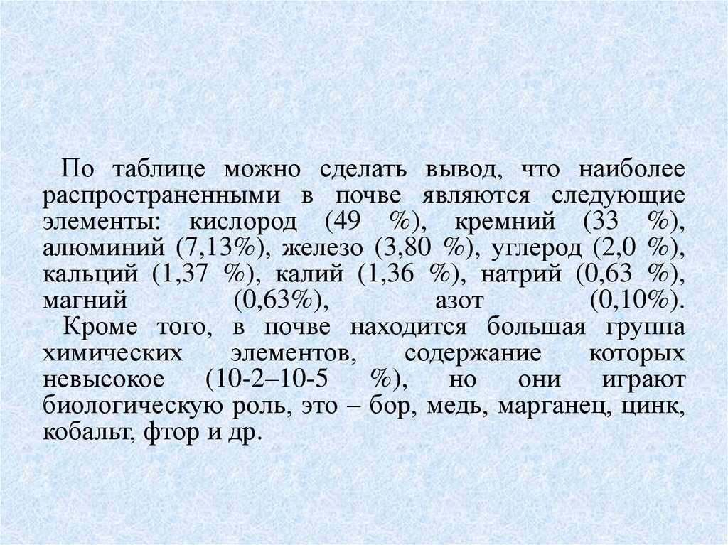 • Знание химического состава почвы необходимо,так как с помощью него можно судить о