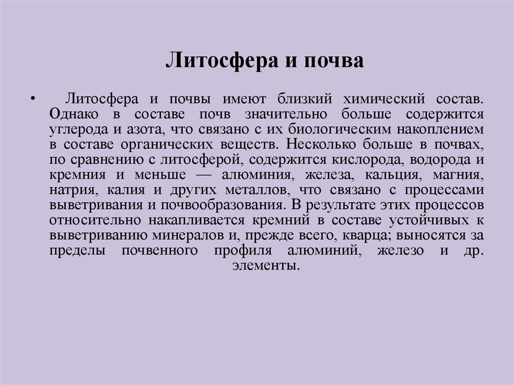 Литосфера и почваЛитосфера и почвы имеют близкий химический состав.