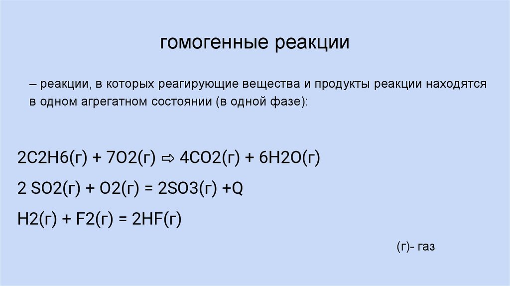 гомогенные реакции– реакции, в которых реагирующие вещества и продукты реакции находятся