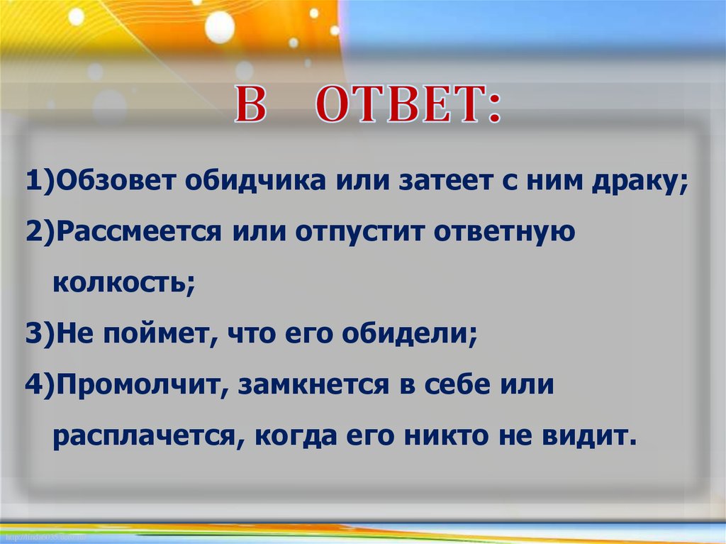 1)Обзовет обидчика или затеет с ним драку;