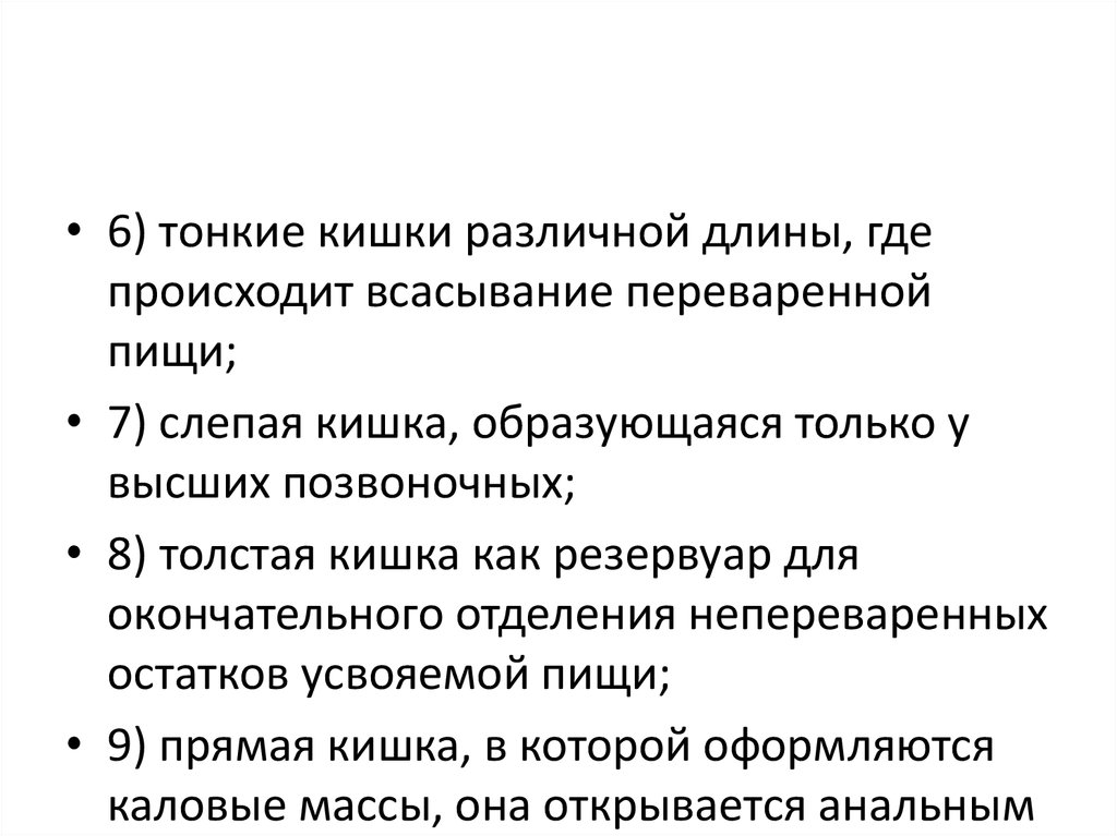 • 6) тонкие кишки различной длины, гдепроисходит всасывание переваренной