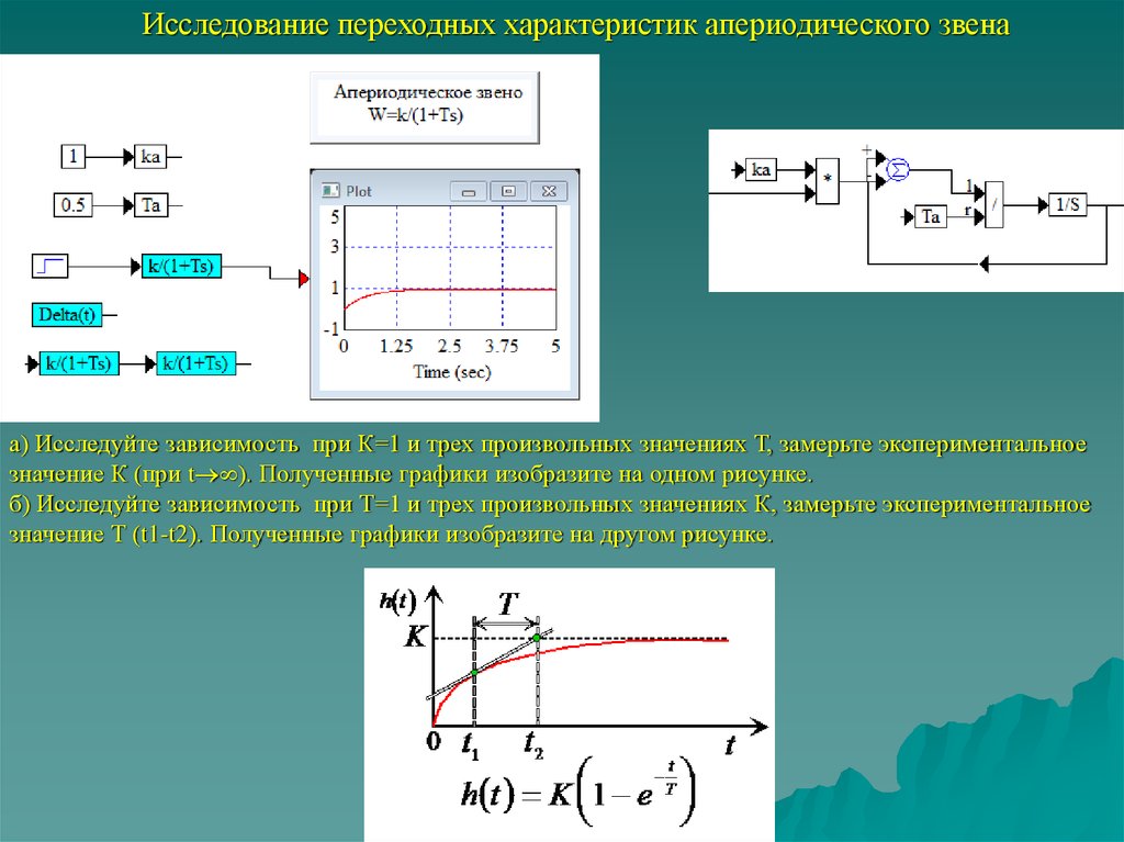 Исследование переходных характеристик апериодического звенаа) Исследуйте зависимость при К=1 и трех произвольных значениях Т, замерьте экспериментальное