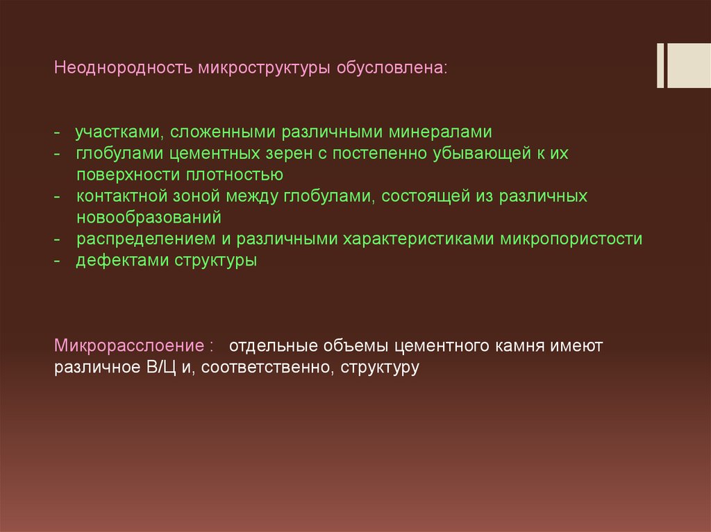 Микрорасслоение : отдельные объемы цементного камня имеют
