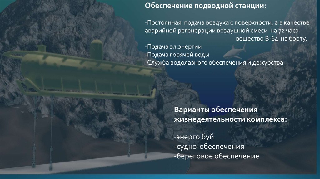 Обеспечение подводной станции:-Постоянная подача воздуха с поверхности, а в качестве