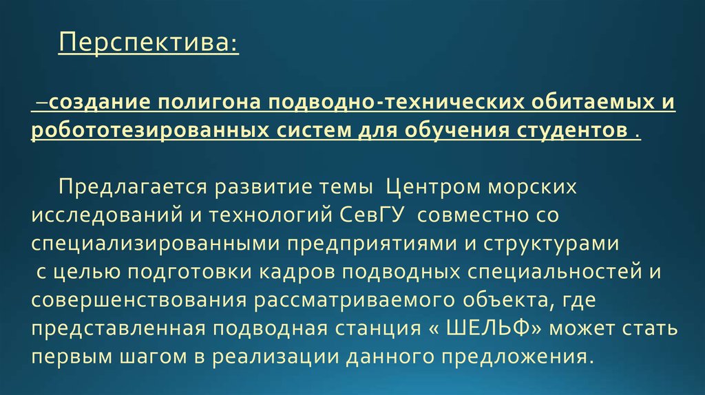 Перспектива:–создание полигона подводно-технических обитаемых и