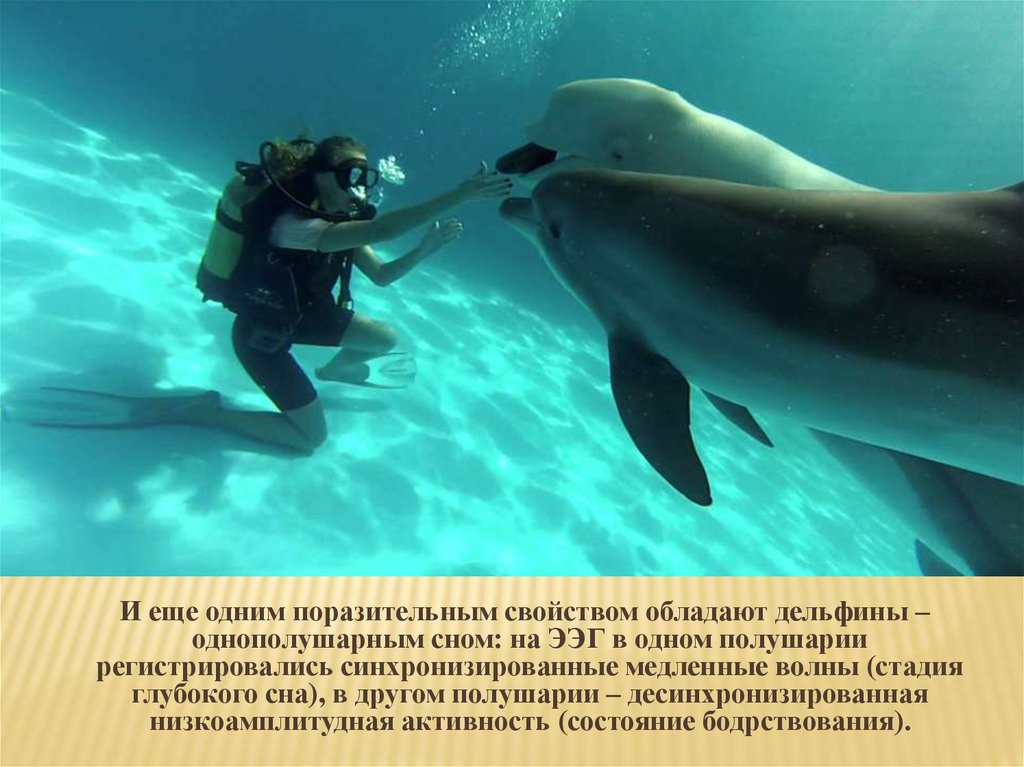 И еще одним поразительным свойством обладают дельфины –однополушарным сном: на ЭЭГ в одном полушарии
