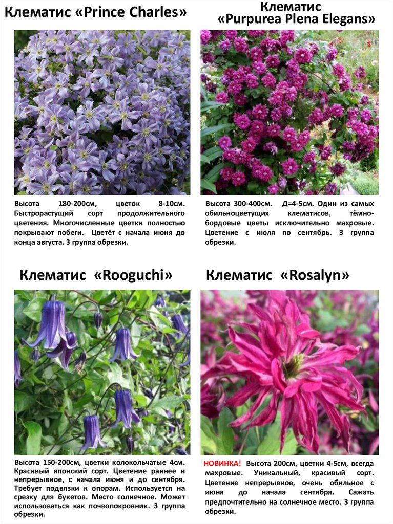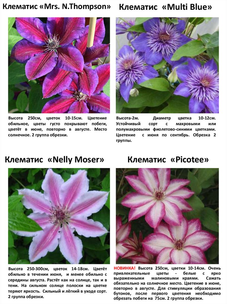 Цветки крупные, фиолетово-синие, с тёмнокрасными тычинками. 2 группа обрезки.