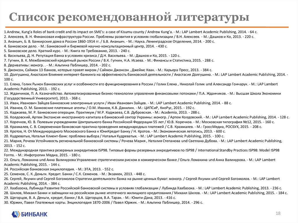 Список рекомендованной литературы1.Andrew, Kung'a Roles of bank credit and its impact on SME’s: a case of Kisumu county / Andrew Kung'a. - М.: LAP Lambert Academic Publishing, 2014. - 64 c.