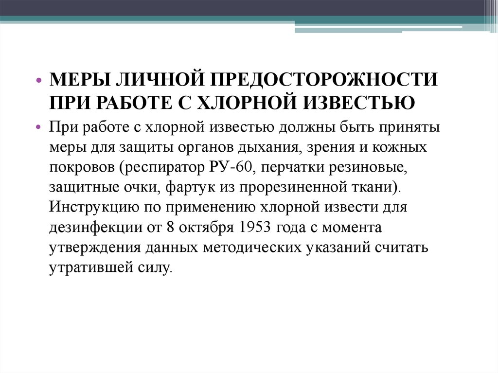 • МЕРЫ ЛИЧНОЙ ПРЕДОСТОРОЖНОСТИПРИ РАБОТЕ С ХЛОРНОЙ ИЗВЕСТЬЮ