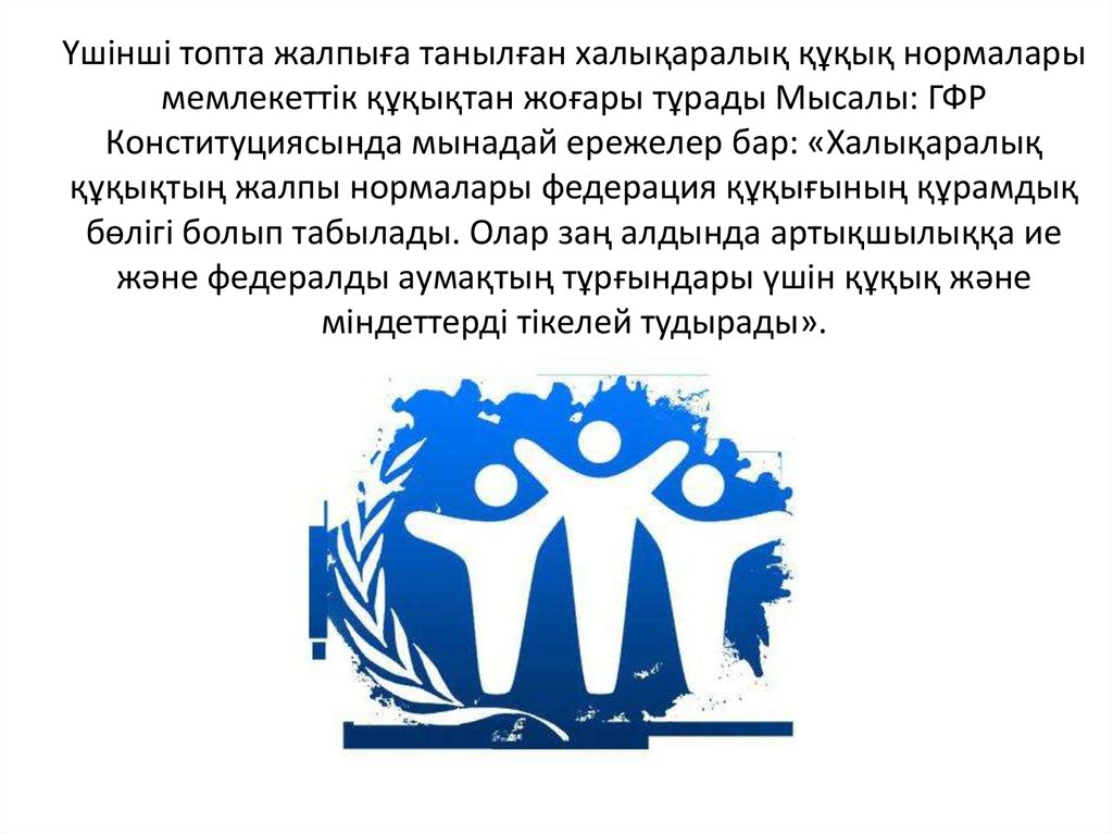 Үшінші топта жалпыға танылған халықаралық құқық нормаларымемлекеттік құқықтан жоғары тұрады Мысалы: ГФР