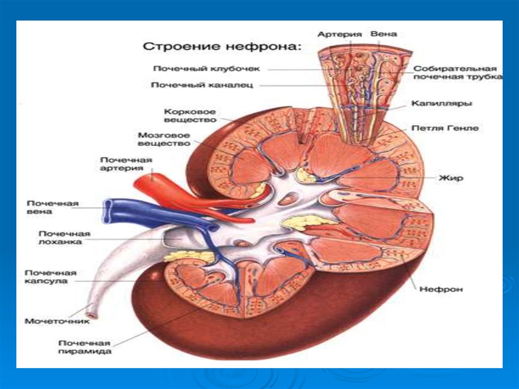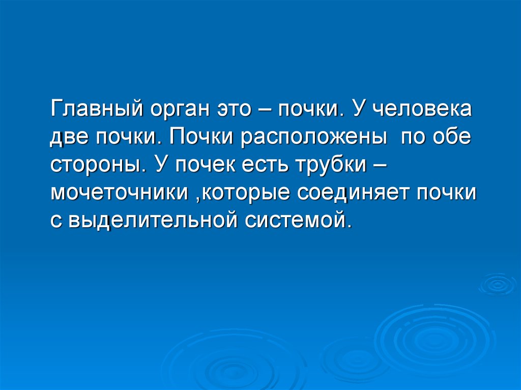 Главный орган это – почки. У человекадве почки. Почки расположены по обе