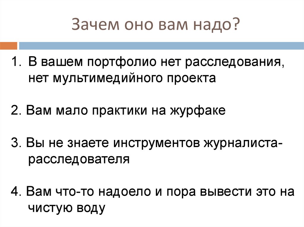 Зачем оно вам надо?1. В вашем портфолио нет расследования,