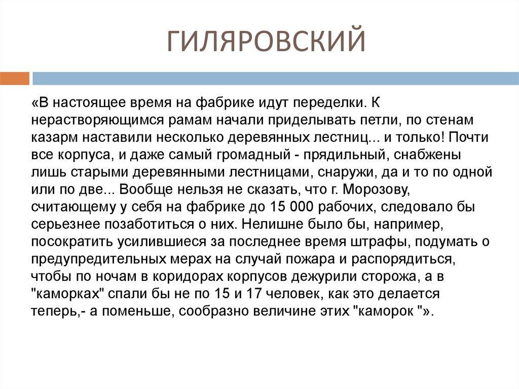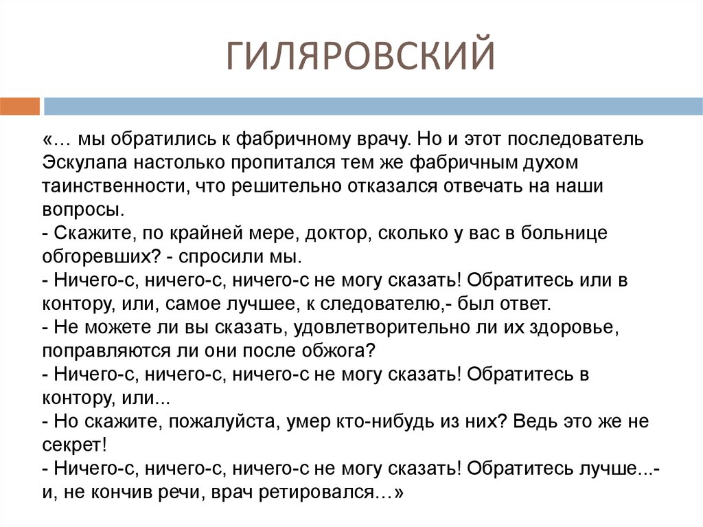 ГИЛЯРОВСКИЙ«… мы обратились к фабричному врачу. Но и этот последователь