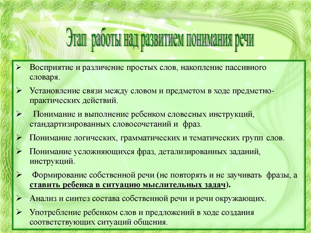Восприятие и различение простых слов, накопление пассивногословаря.