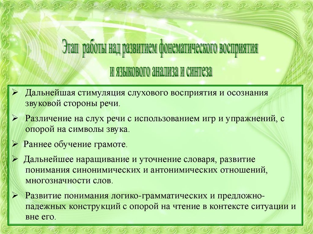 Дальнейшая стимуляция слухового восприятия и осознаниязвуковой стороны речи.