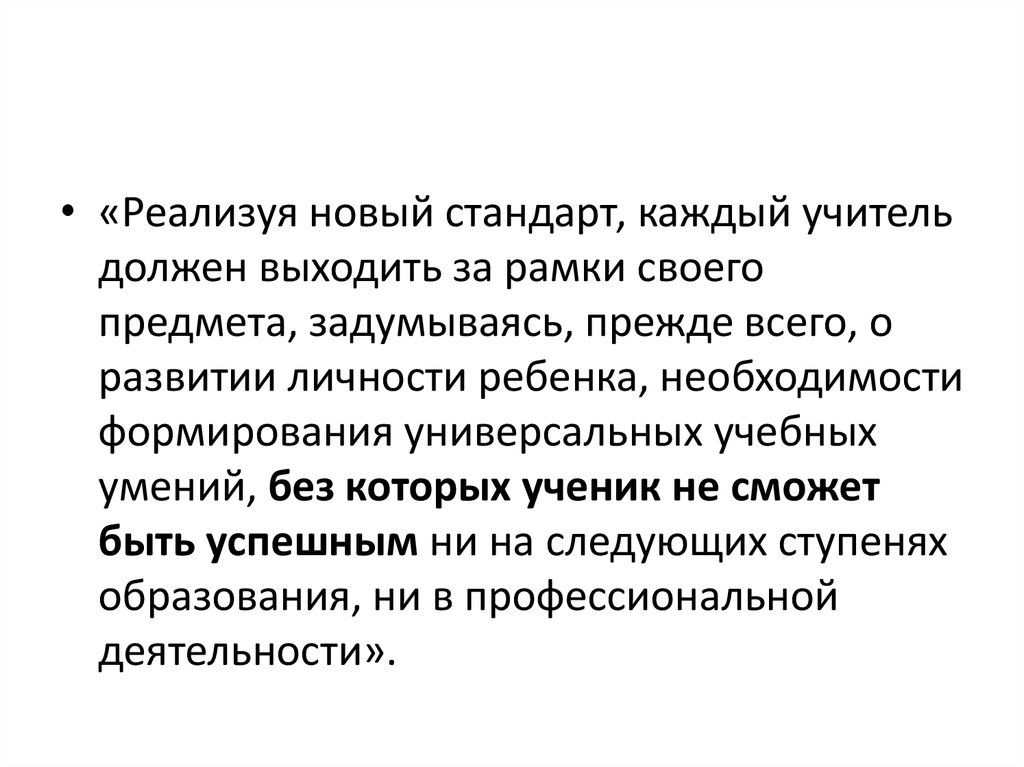 • «Реализуя новый стандарт, каждый учительдолжен выходить за рамки своего
