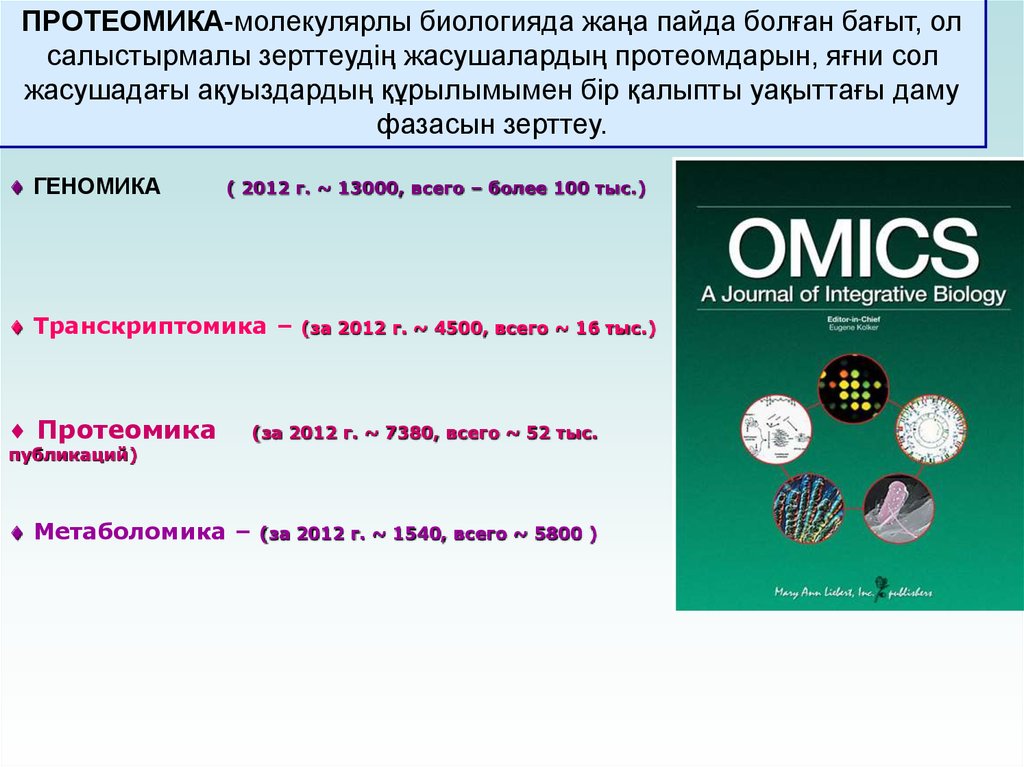 ПРОТЕОМИКА-молекулярлы биологияда жаңа пайда болған бағыт, олсалыстырмалы зерттеудің жасушалардың протеомдарын, яғни сол