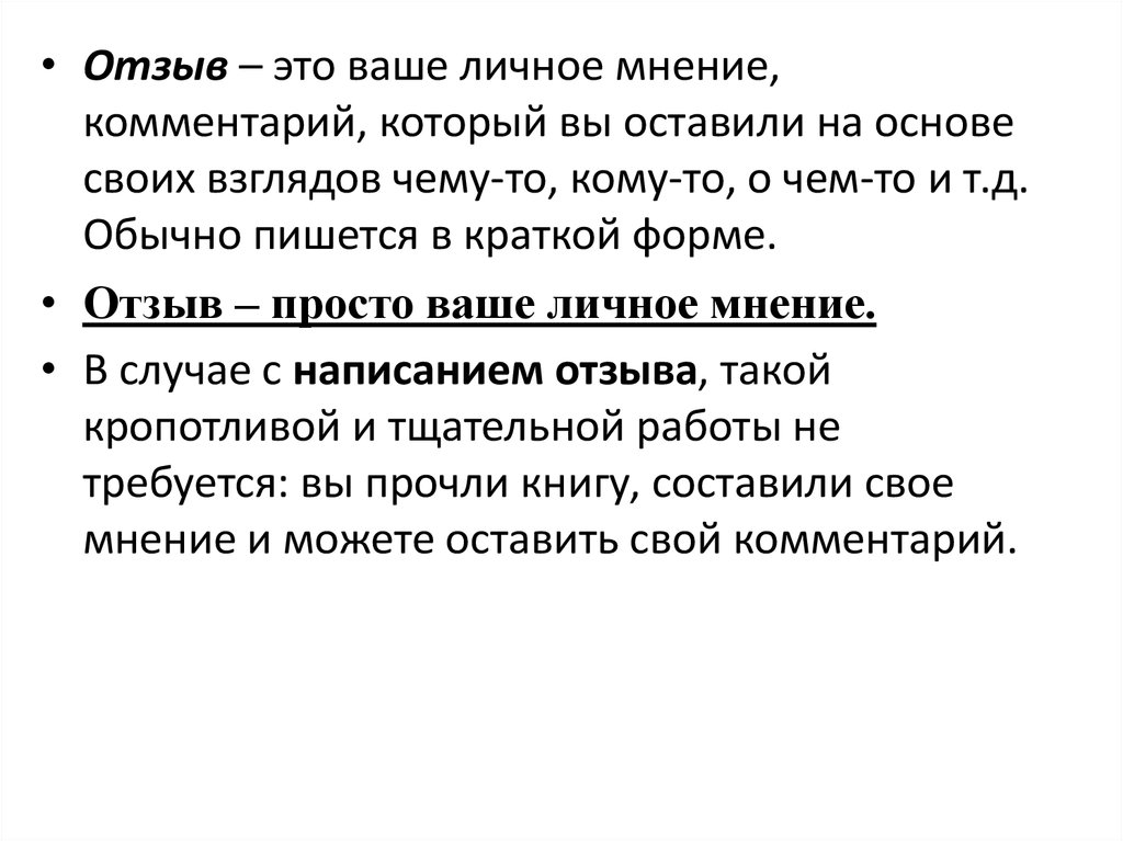 • Отзыв – это ваше личное мнение,комментарий, который вы оставили на основе