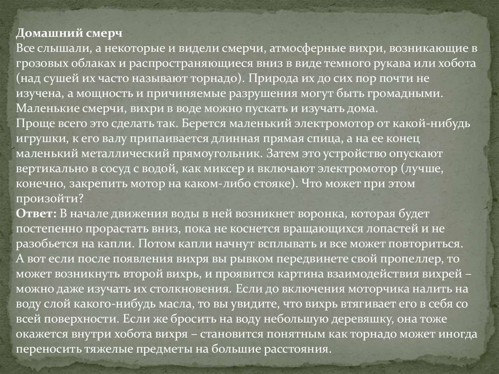 Домашний смерчВсе слышали, а некоторые и видели смерчи, атмосферные вихри, возникающие в