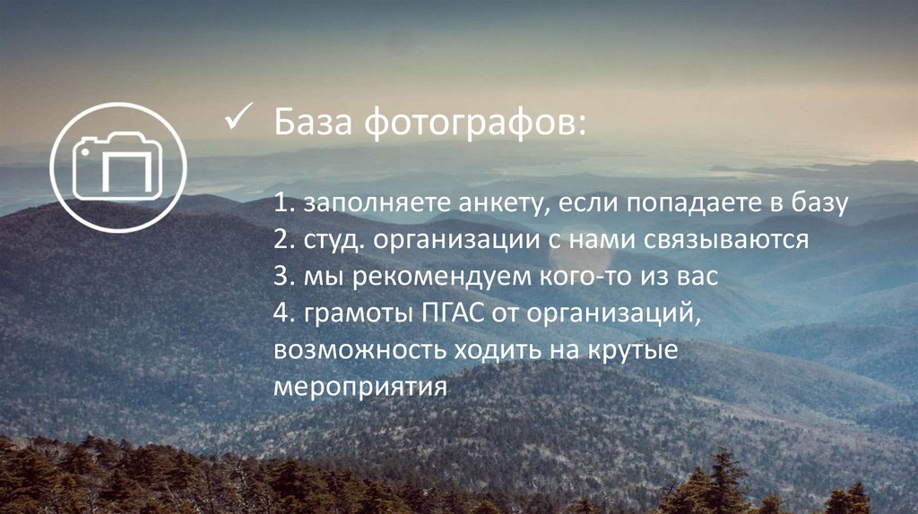 База фотографов:1. заполняете анкету, если попадаете в базу