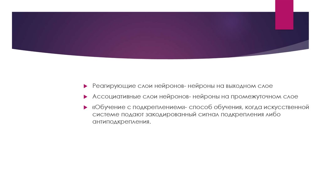 Реагирующие слои нейронов- нейроны на выходном слоеАссоциативные слои нейронов- нейроны на промежуточном слое