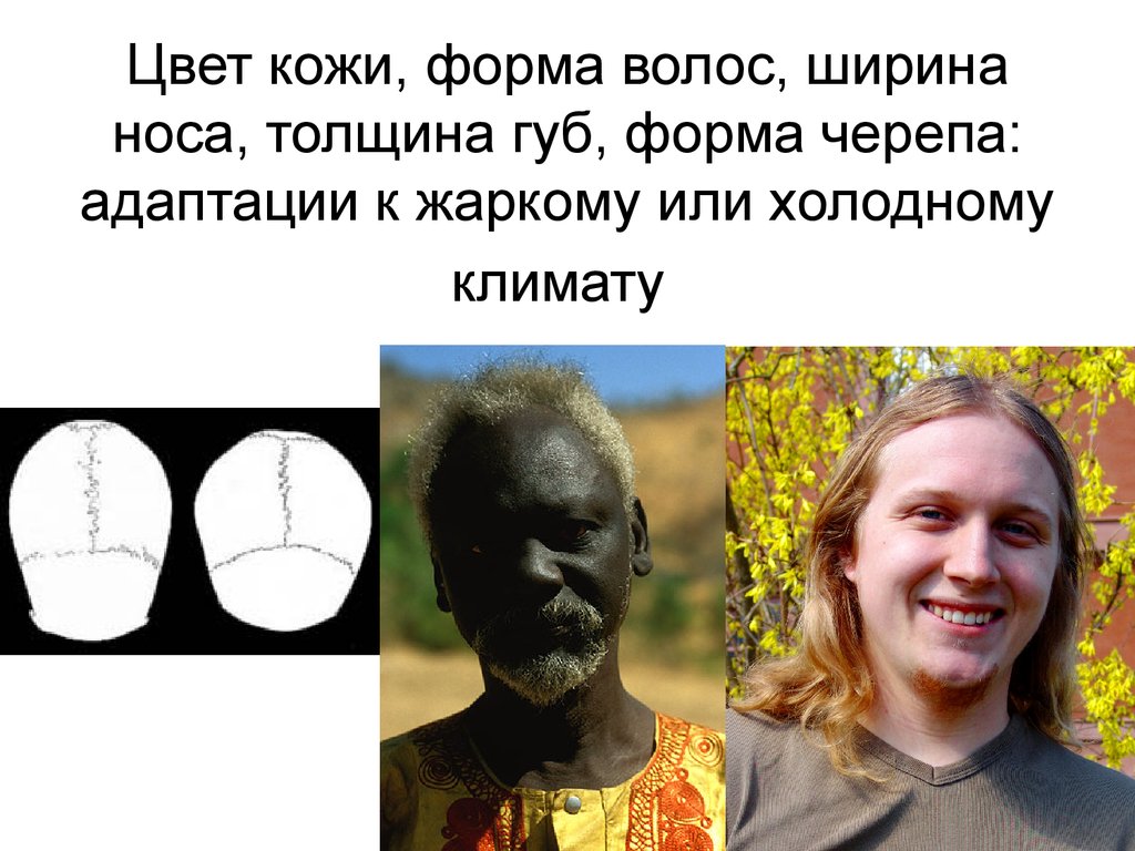 Цвет кожи, форма волос, ширинаноса, толщина губ, форма черепа: