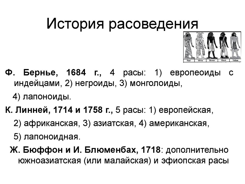 История расоведенияФ. Бернье, 1684 г., 4 расы: 1) европеоиды с