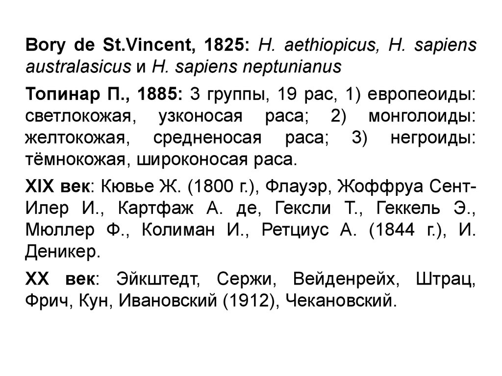 Bory de St.Vincent, 1825: H. aethiopicus, H. sapiensaustralasicus и H. sapiens neptunianus