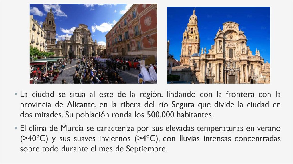 • La ciudad se sitúa al este de la región, lindando con la frontera con laprovincia de Alicante, en la ribera del río Segura que divide la ciudad en