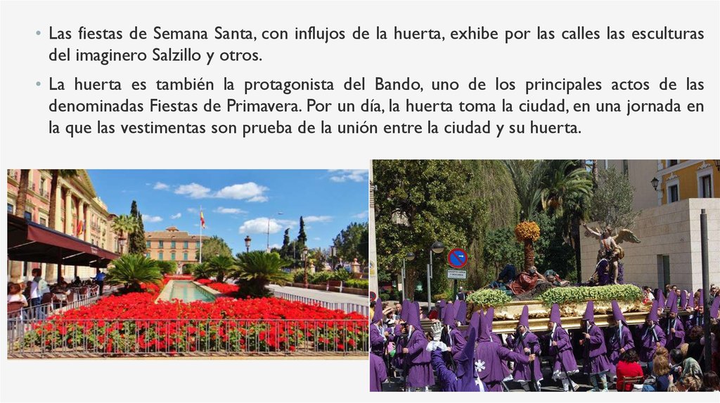 • Las fiestas de Semana Santa, con influjos de la huerta, exhibe por las calles las esculturasdel imaginero Salzillo y otros.