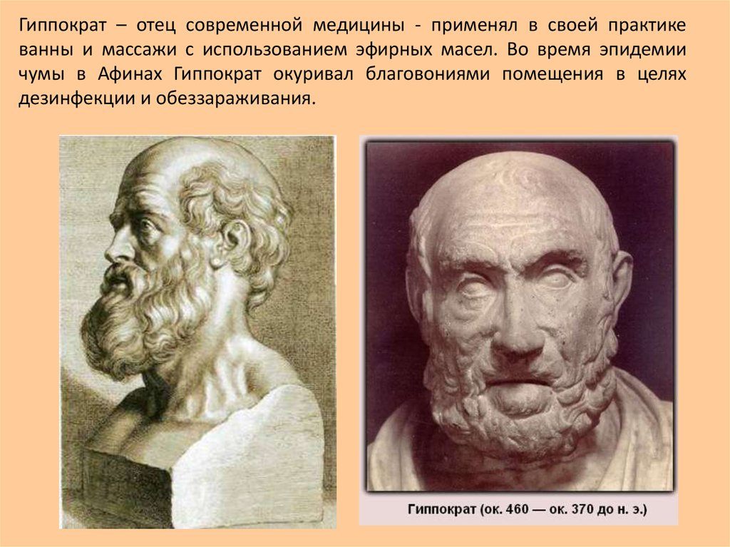 Гиппократ – отец современной медицины - применял в своей практикеванны и массажи с использованием эфирных масел. Во время эпидемии