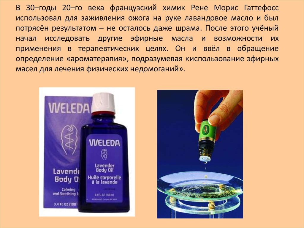 В 30–годы 20–го века французский химик Рене Морис Гаттефоссиспользовал для заживления ожога на руке лавандовое масло и был