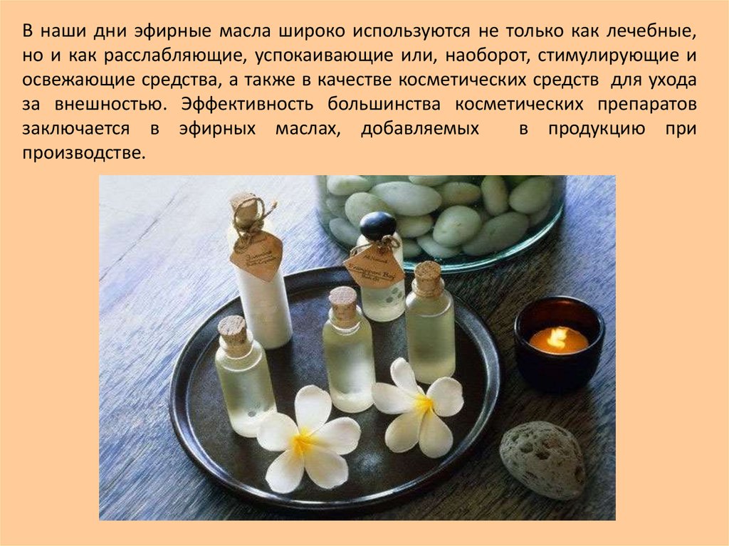 В наши дни эфирные масла широко используются не только как лечебные,но и как расслабляющие, успокаивающие или, наоборот, стимулирующие и