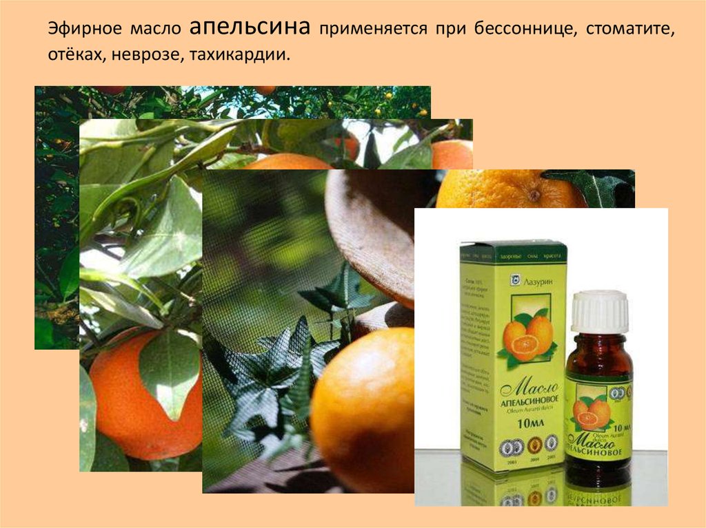 Эфирное масло апельсина применяется при бессоннице, стоматите,отёках, неврозе, тахикардии.