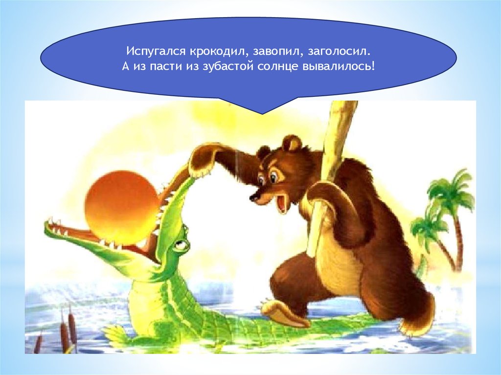 Испугался крокодил, завопил, заголосил.А из пасти из зубастой солнце вывалилось!