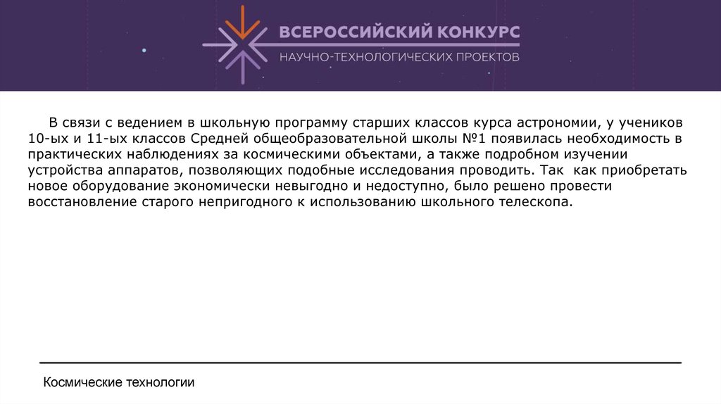 В связи с ведением в школьную программу старших классов курса астрономии, у учеников10-ых и 11-ых классов Средней общеобразовательной школы №1 появилась необходимость в