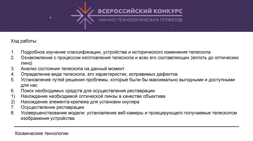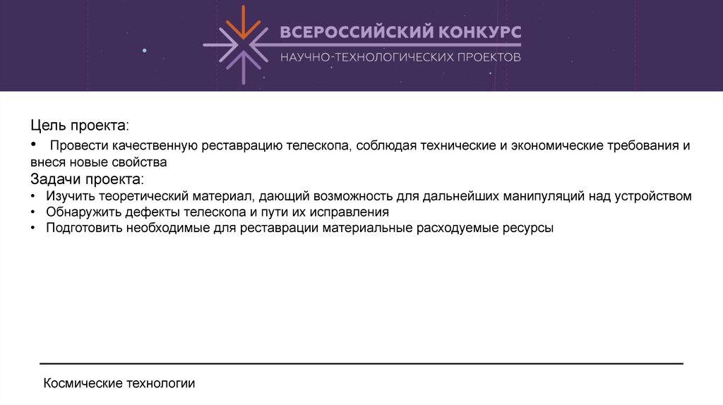 Цель проекта:Провести качественную реставрацию телескопа, соблюдая технические и экономические требования и