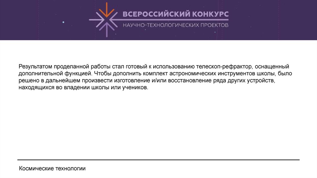 Результатом проделанной работы стал готовый к использованию телескоп-рефрактор, оснащенныйдополнительной функцией. Чтобы дополнить комплект астрономических инструментов школы, было