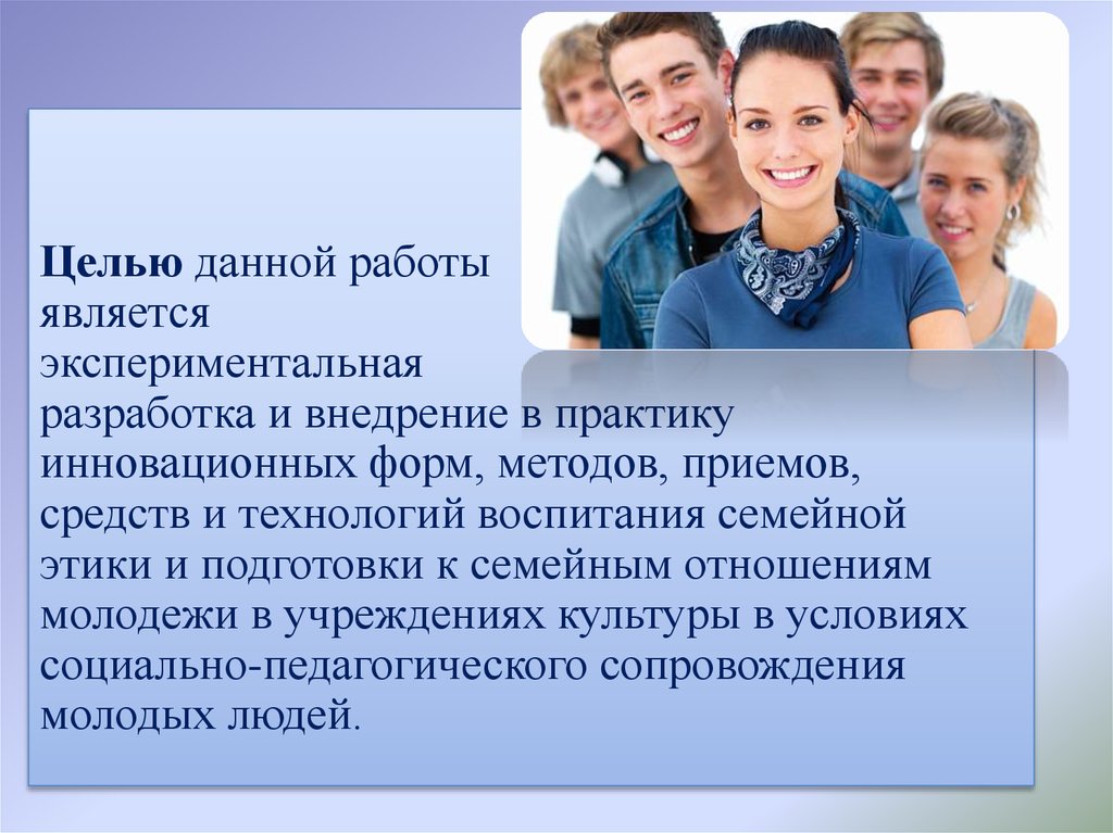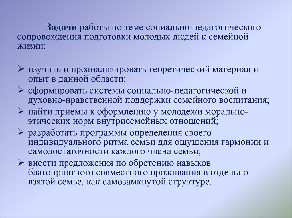 Задачи работы по теме социально-педагогическогосопровождения подготовки молодых людей к семейной