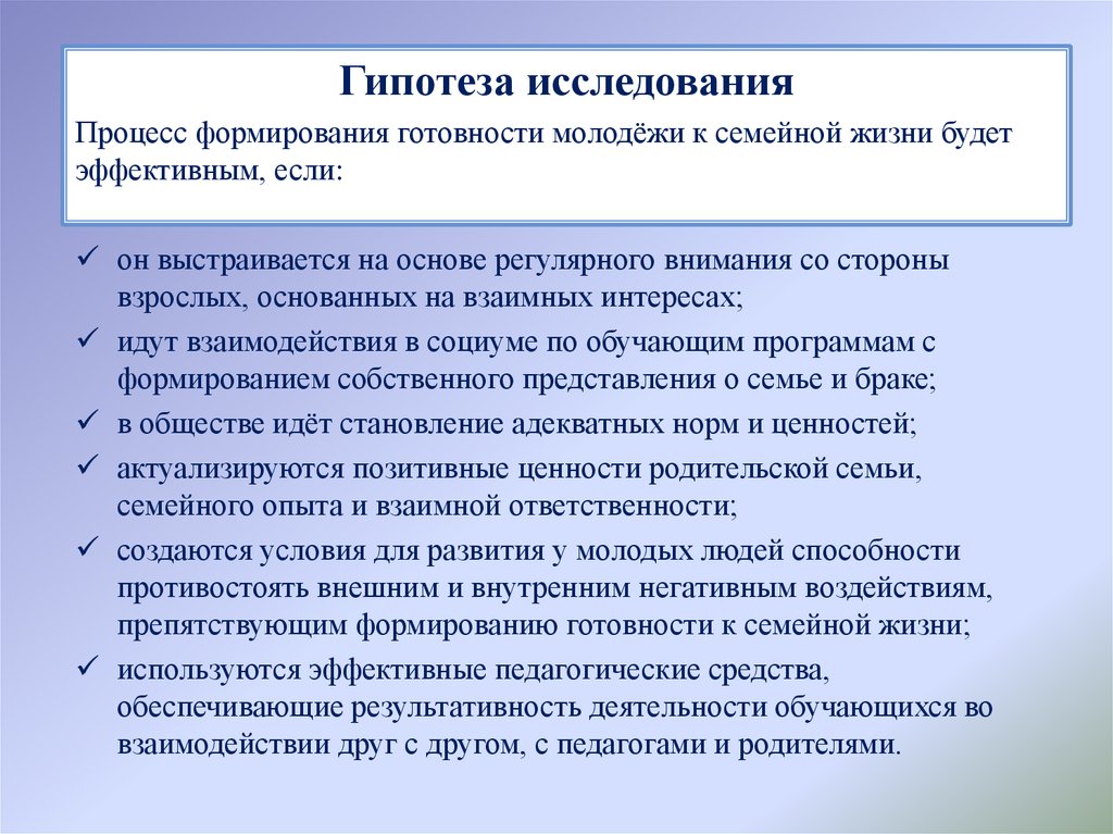 Гипотеза исследованияПроцесс формирования готовности молодёжи к семейной жизни будет