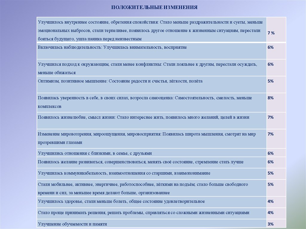 ПОЛОЖИТЕЛЬНЫЕ ИЗМЕНЕНИЯУлучшилось внутреннее состояние, обретения спокойствия: Стало меньше раздражительности и суеты, меньше
