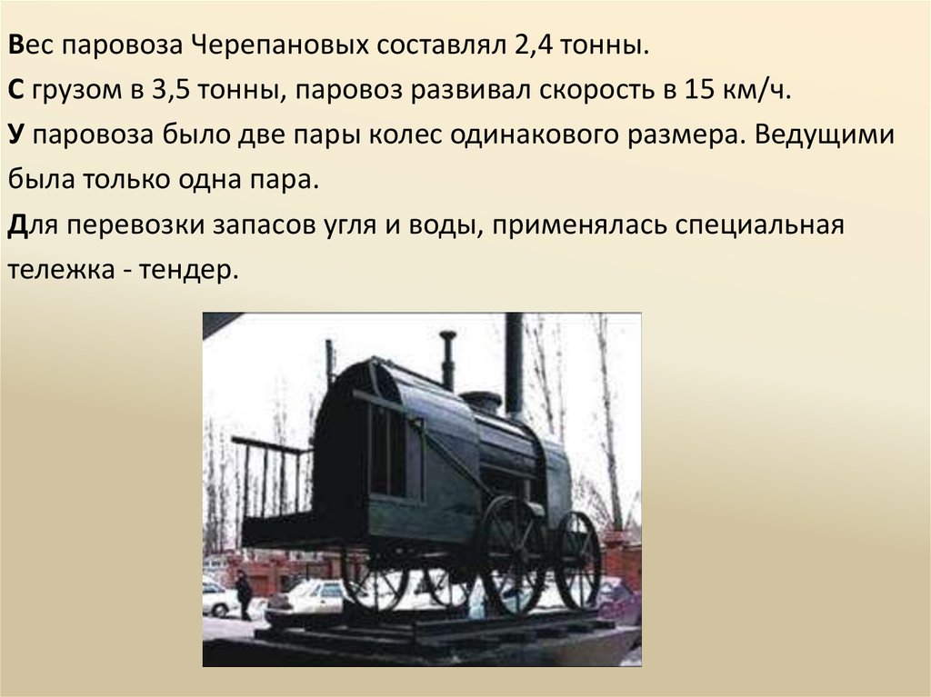 Вес паровоза Черепановых составлял 2,4 тонны.С грузом в 3,5 тонны, паровоз развивал скорость в 15 км/ч.