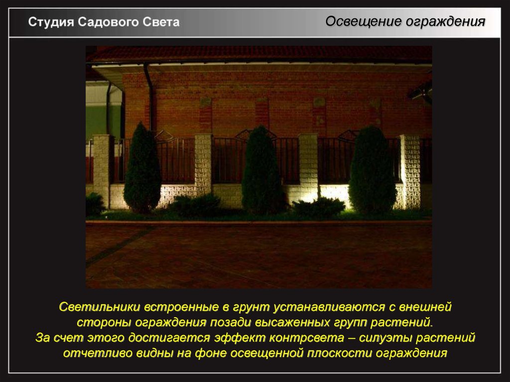 Освещение огражденияСветильники встроенные в грунт устанавливаются с внешней