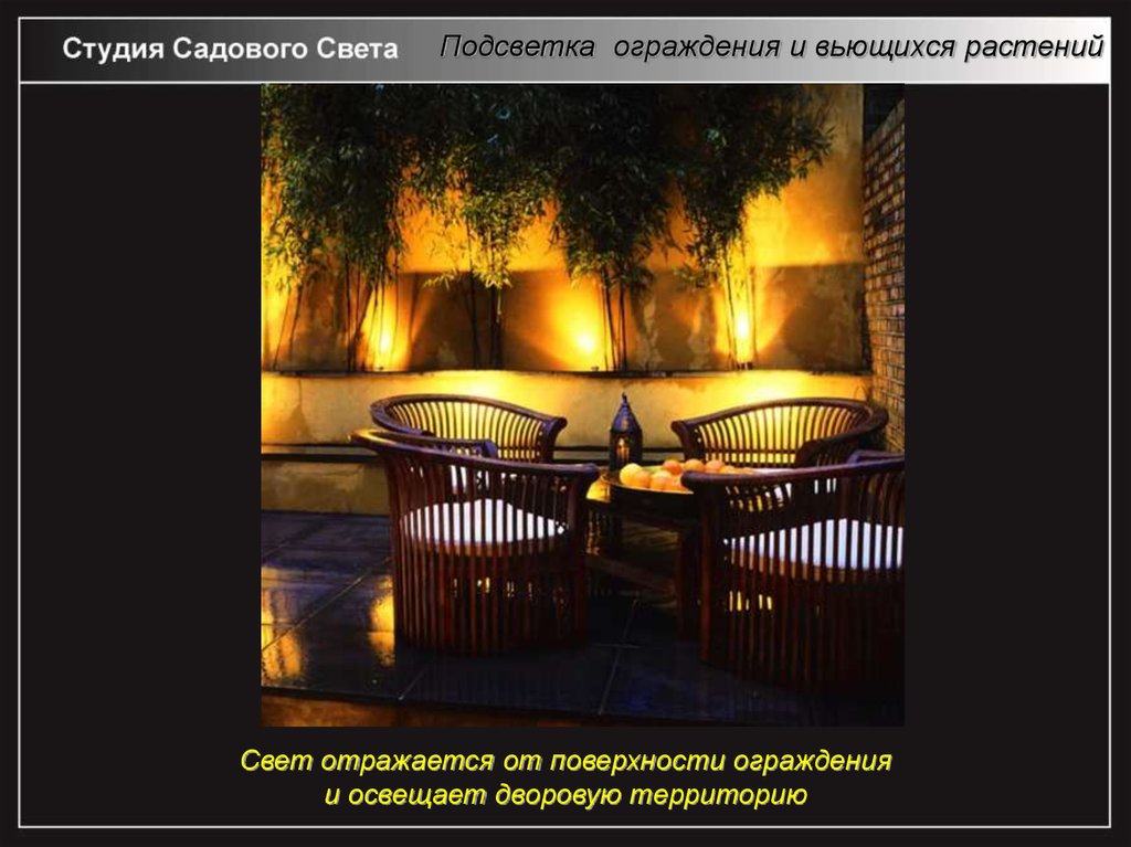 Подсветка ограждения и вьющихся растенийСвет отражается от поверхности ограждения