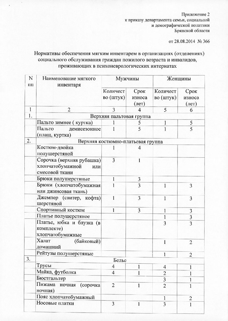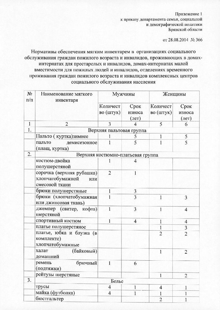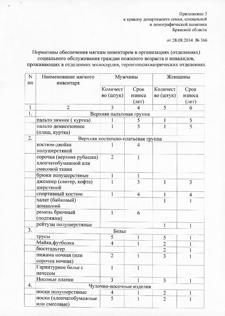 Приказ об утверждении нормативов обеспечения мягким инвентарем в организациях социального обслуживания Брянской области