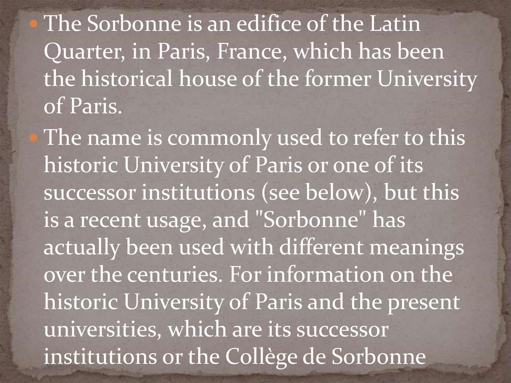 The Sorbonne is an edifice of the LatinQuarter, in Paris, France, which has been