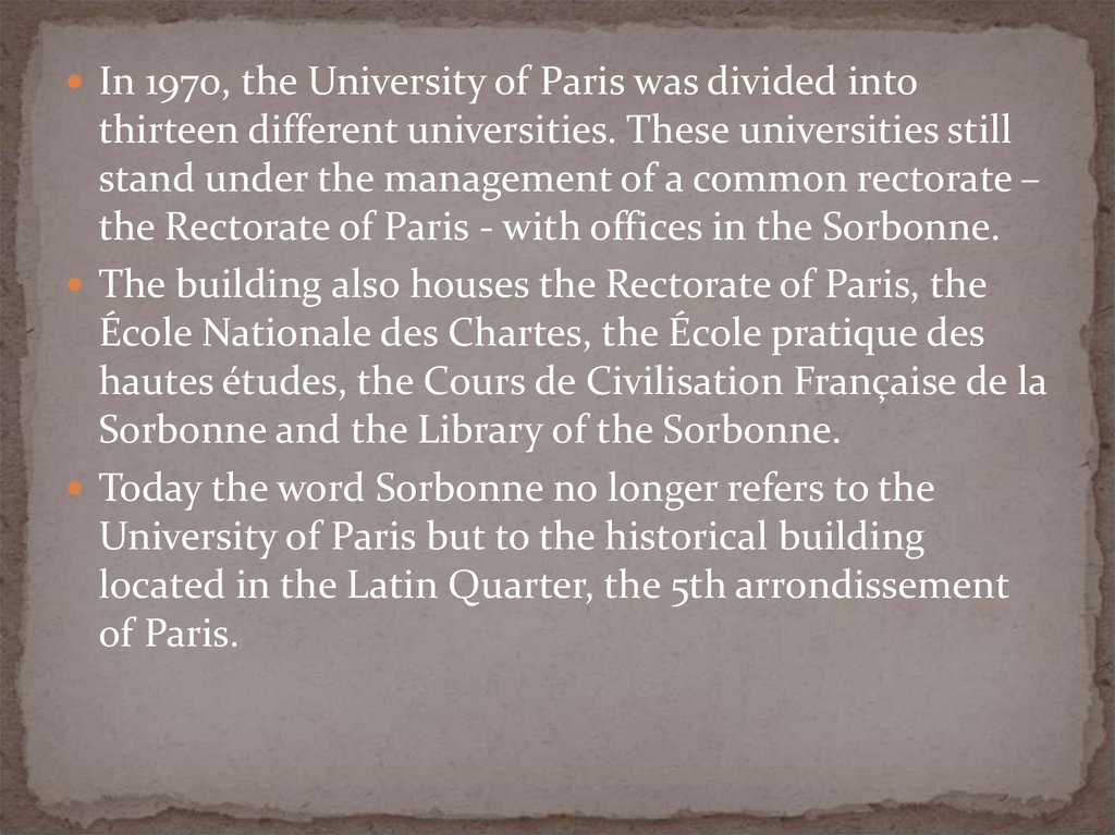 In 1970, the University of Paris was divided intothirteen different universities. These universities still