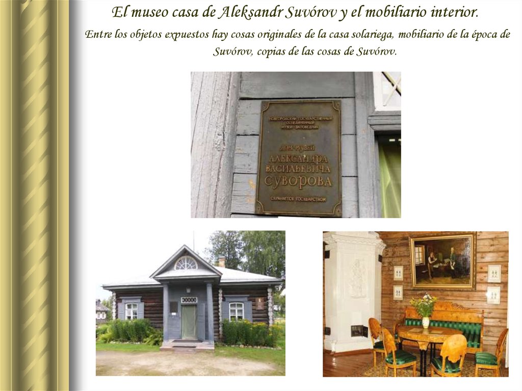 El museo casa de Aleksandr Suvórov y el mobiliario interior.Entre los objetos expuestos hay cosas originales de la casa solariega, mobiliario de la época de